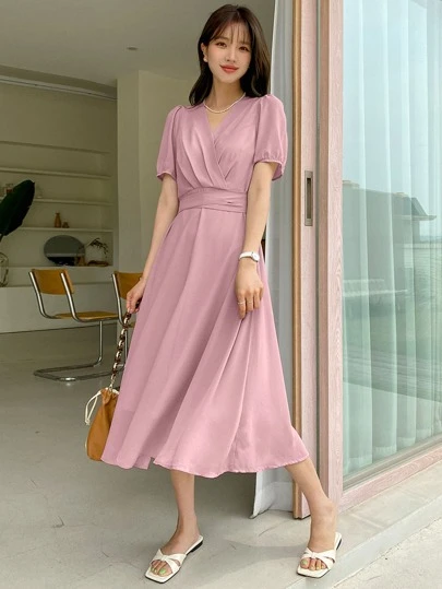 DAZY Vestido de cuello cruzado de manga farol - Rosa - Añade 3