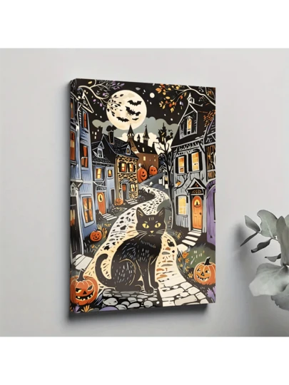 1 pieza Cartel de arte de pared de lienzo enmarcado Impresión de arte popular vintage de gato negro de Halloween, Arte de pared de Halloween Town, Arte de calabaza de Halloween, Decoración de Halloween para el hogar, Póster de Halloween - Negro - Añade 1