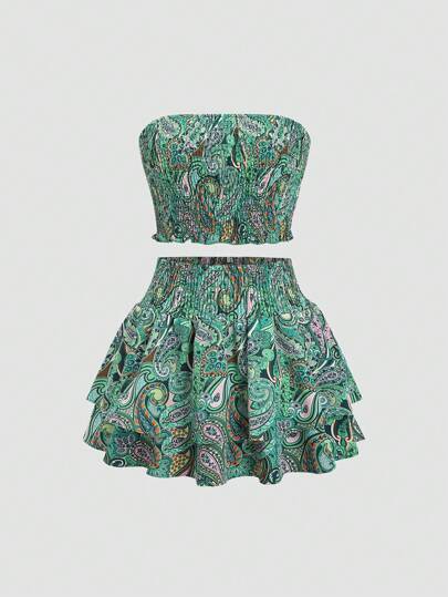 Conjunto de 2 piezas con top tubo bordado con estampado de leopardo y falda con volantes tejida, look Y2K - Verde - Añade 1