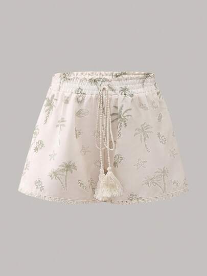 Sweetra Short bohemio con cordón de mujer con estampado de palmera y flecos - Blanco - Añade 1