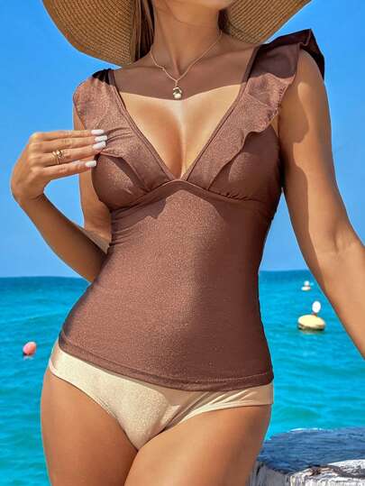 Swim Lushoire Set de 2 piezas de traje de baño de verano conservador y maduro para mujeres: Top con cuello en V y volantes con tela brillante de unicolor y Bottom triangular básica de unicolor - Marrón - Añade 1