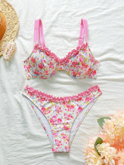 Swim Mod Conjunto de bikini con pliegues con estampado floral ditsy para mujer, lindo y romántico - Amarillo - Añade 3