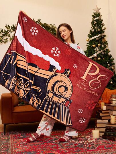 THE POLAR EXPRESS X SHEIN Manta de franela con patrón de tren y copos de nieve, para regalo de Navidad - Multicolor - Añade 1