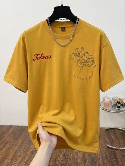 TOKVUE Camiseta de manga corta casual de estilo callejero con bordado divertido para hombres - Amarillo - Añade 1