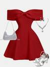 SHEIN Girlism Vestido de moda con hombros y dobladillo fruncidos, decoración de flor de metal de color rojo sólido para niñas adolescentes