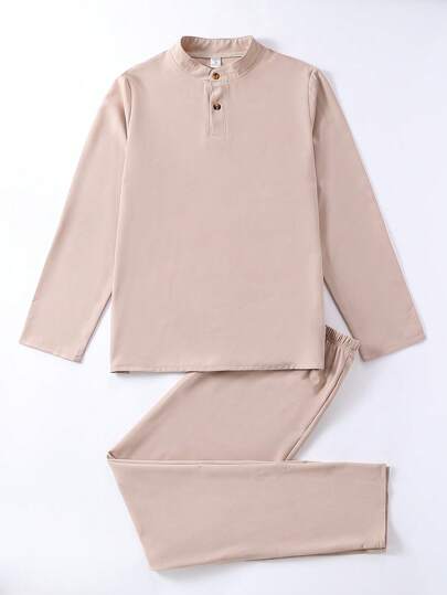 Ropa De Casa Holgada De Manga Larga Y Pantalones Largos En Color Albaricoque Profundo Y Diseño Simple Para Adolescentes - Albaricoque - Añade 1