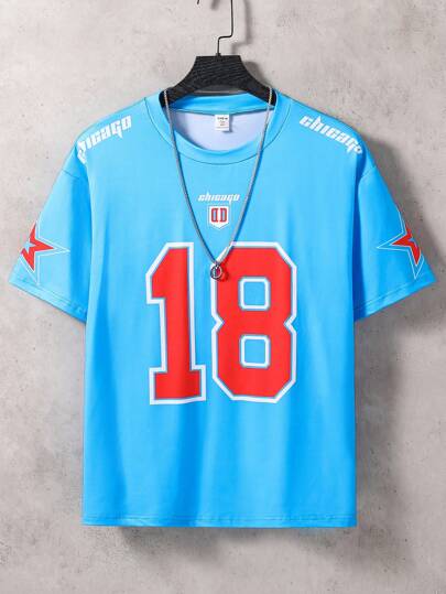 SHEIN Camiseta de manga corta con estampado numérico de estilo deportivo para chicos adolescentes - Celeste - Añade 5