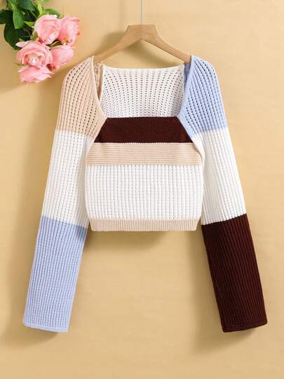 Jersey de punto para adolescente con cuello cuadrado de color contrastado, manga acampanada corta y delgados adornos en hollow out - Multicolor - Añade 1
