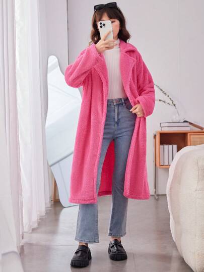 Chica adolescente Abrigo teddy de cuello con solapa de hombros caídos - Rosa Fucsia - Añade 1