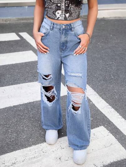 SHEIN Jeans de mezclilla azul desgastados de corte holgado para adolescentes - Lavado ligero - Añade 7