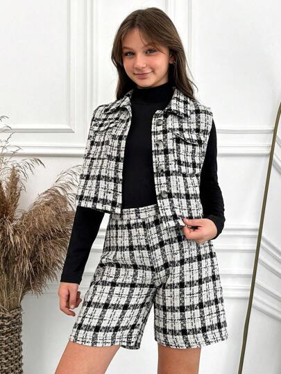 RueChic Chica adolescente Cazadora chaleco con estampado de cuadros & Shorts - Blanco y Negro - Añade 5