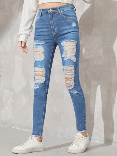 SHEIN Jeans rasgados con borde crudo para adolescente - Azul lavado medio - Añade 1