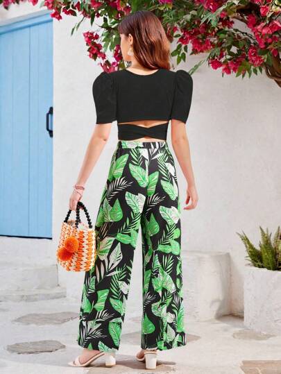 Conjunto de 2 piezas para adolescentes con top de manga corta y cuello redondo de unicolor y pantalones largos - Verde - Añade 1