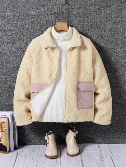 SHEIN Chaqueta de cuello alto con bloque de color de parche a cuadros de diamante para niñas preadolescentes en otoño/invierno - Albaricoque - Añade 5