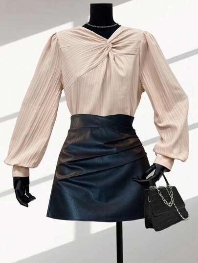 Chiquease Camisa de manga larga cuello redondo con detalle de torsión de tela texturizada - Albaricoque - Añade 1