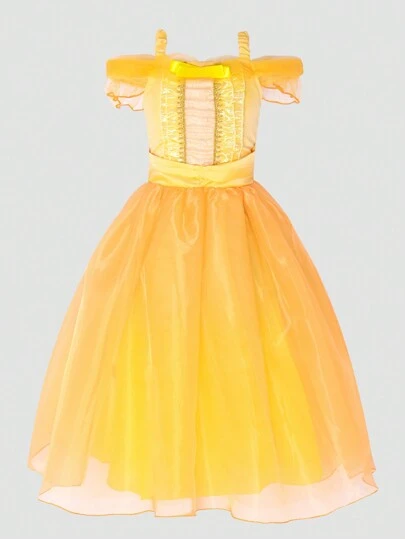 Niñas Vestido de fiesta de hombros descubiertos con lazo delantero con malla - Amarillo - Añade 1