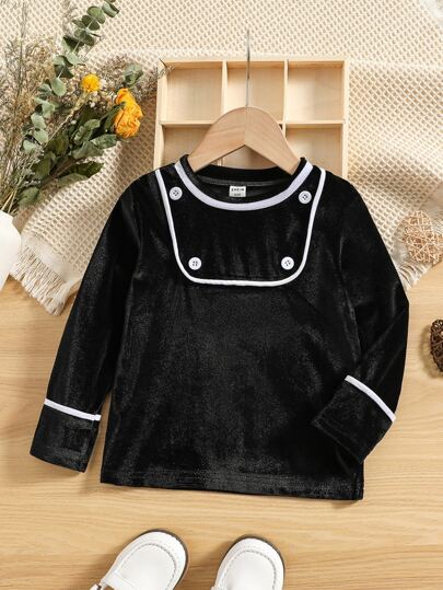 Niñas Blusa con cinta en contraste con botón falso - Negro - Añade 1