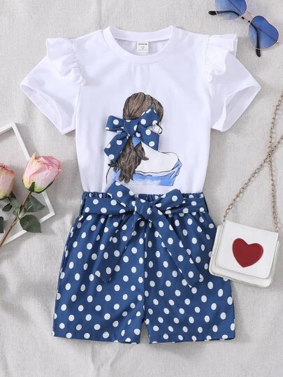 Niñas con estampado de figura con lazo delantero ribete con fruncido Camiseta & con estampado de lunares Shorts - Azul y blanco - Añade 1