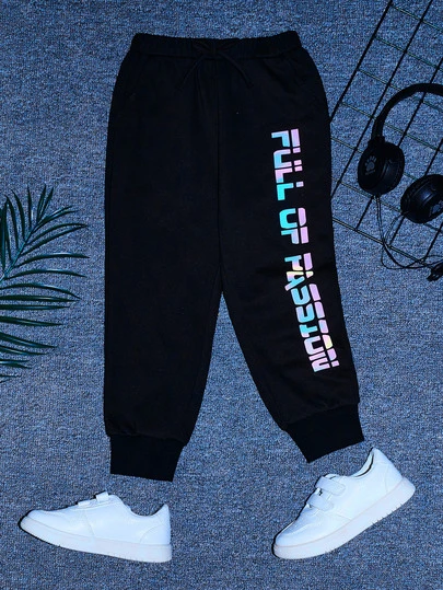 SHEIN Niñas Pantalones deportivos reflectante con estampado de letra - Negro - Añade 4