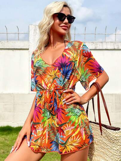 SHEIN Swim Vestido cover up con estampado tropical con cordón delantero - Multicolor - Añade 5