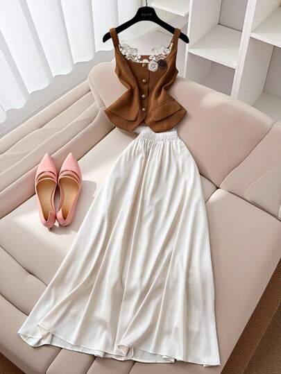 Franclia Set de 2 piezas que consta de top ajustado sin mangas con volantes y falda mini con bordado floral, atuendo casual - Marrón - Añade 1