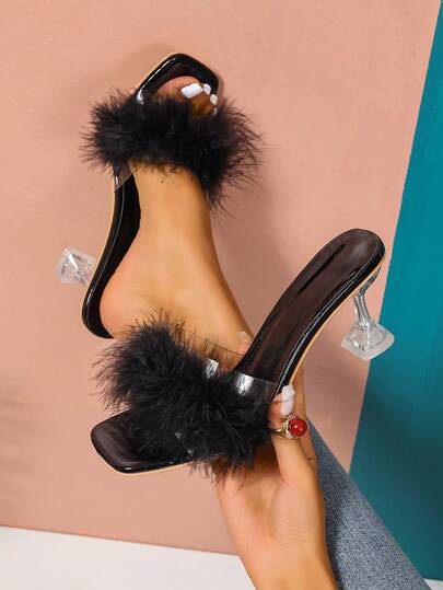 Sandalias de mula de verano para mujer, abierta al dedo, con plumas esponjosas, tacón alto de cristal transparente de moda casual, negro - Negro - Añade 4