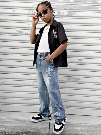 SHEIN Explorewe Vaqueros rectos lavados con bordado cruzado para niños preadolescentes - Azul lavado medio - Añade 2