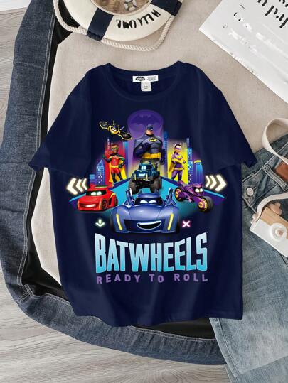 Batwheels X SHEIN Camiseta casual de manga corta y cuello redondo para niño preadolescente, con estampado de autos de color azul profundo - Blanco - Añade 1