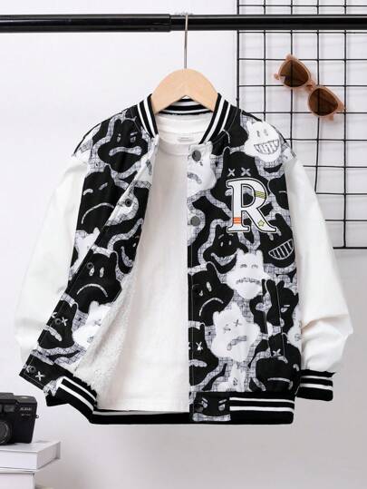 SHEIN Chico preadolescente Cazadora tipo bomber Halloween con estampado de dibujos animados ribete de rayas térmico sin camiseta - Blanco y Negro - Añade 1