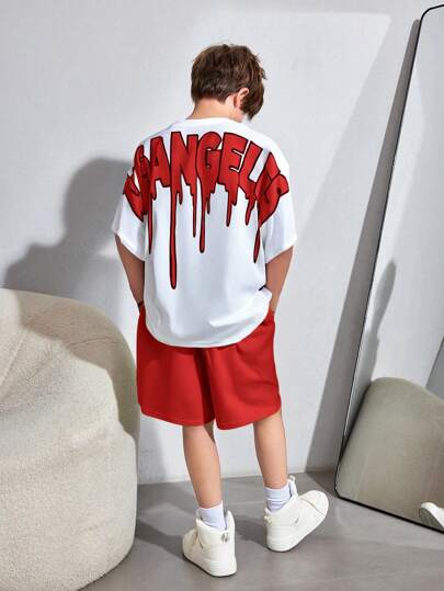 SHEIN Leap Crew Conjunto de camiseta de manga corta y pantalones cortos de estilo callejero para niño preadolescente - Rojo - Añade 1