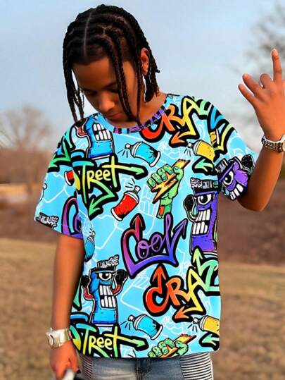 SHEIN Camiseta De Manga Corta Con Estampado De Letras Y Dibujos Animados Para Niño Tween - Multicolor - Añade 1