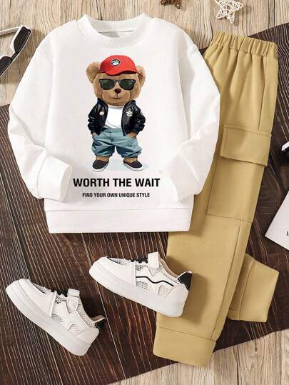 Conjunto de sudadera de cuello redondo y pantalón de chándal con estampado gráfico de dibujos animados para niños preadolescentes - Blanco - Añade 1