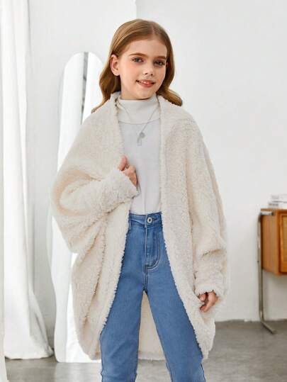 Abrigo con mangas tipo murciélago y frente abierto de imitación de peluche de oso de peluche para mantener el calor para niña preadolescente - Beis - Añade 6