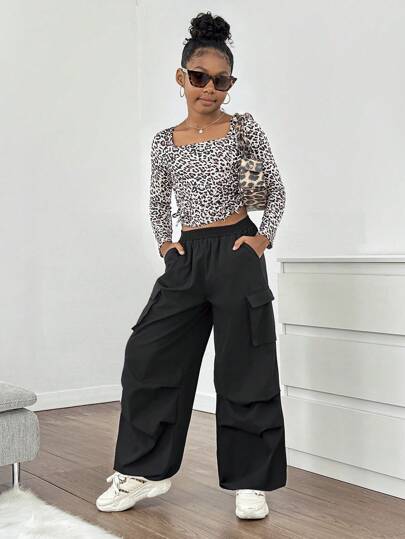 SHEIN Conjunto informal de 2 piezas para niña preadolescente: Camiseta crop de manga larga con cordón y estampado de leopardo + Pantalón de carga - Negro - Añade 1
