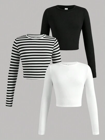SHEIN Girlism Conjunto de 3 piezas para niña preadolescente con camiseta de manga larga de cuello redondo de unicolor a rayas - Blanco y Negro - Añade 3