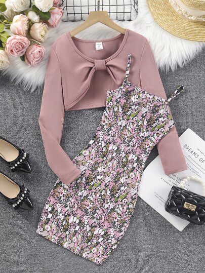 Camiseta Baja De Alto Hem Para Niña Y Vestido Floral De Tirantes - Rosa vieja - Añade 2