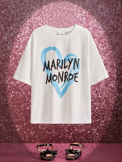 Marilyn Monroe X SHEIN Camiseta De Hombro Caído Para Niña En Edad Tween Con Diseño Gráfico De Letras Y Corazones - Blanco - Añade 1