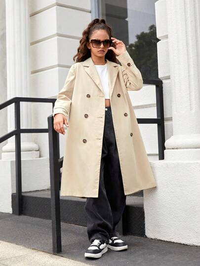 Abrigo casual holgado de unicolor con solapa plisada para niña preadolescente - Caqui - Añade 6
