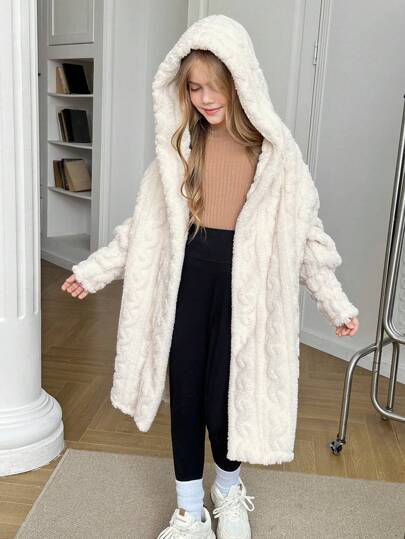 SHEIN Abrigo casual con capucha de ajuste holgado, textura sólida, de longitud media para niña preadolescente, otoño e invierno - Blanco - Añade 1