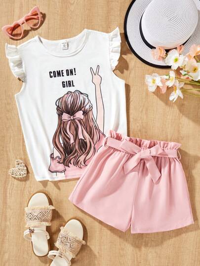 Conjunto de camiseta de manga corta y pantalones cortos para niñas adolescentes con estampado de letras y dibujos animados - Multicolor - Añade 2
