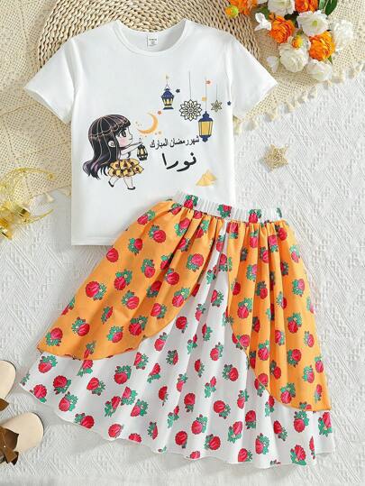 Conjunto de 2 piezas para niña preadolescente que incluye una camiseta de manga corta con estampado de dibujos animados de Ramadán y una falda de color block con estampado de rosas - Multicolor - Añade 1