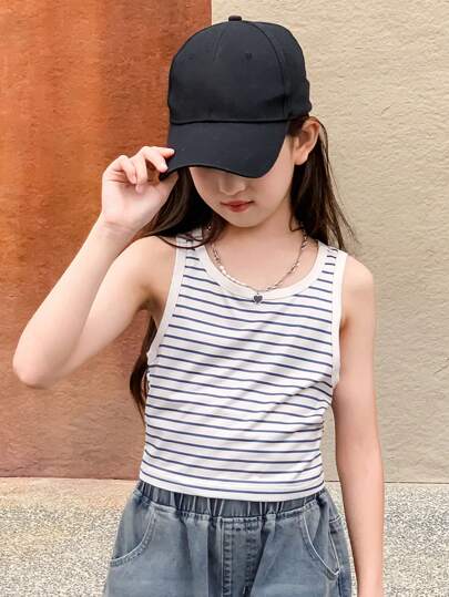 Camiseta sin mangas informal con cuello redondo y estampado rayado para niña preadolescente, para el verano - Multicolor - Añade 1