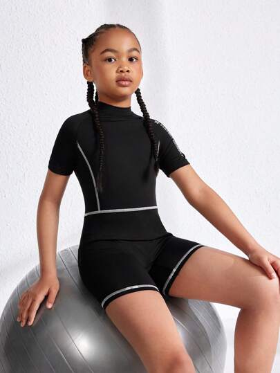 SHEIN Conjunto de corto sencillo para niña preadolescente, negro de manga corta y cuello alto para deportes - Negro - Añade 1