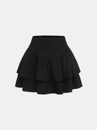 SHEIN Girlism Falda informal de punto para niña preadolescente de unicolor con doble capa en el dobladillo - Negro - Añade 2