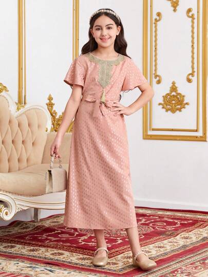 SHEIN Vestido Completo Impreso De Niñas Preadolescentes Con Cinturón Tejido A Bloques De Colores Para Ocasiones Casuales - Rosa - Añade 1