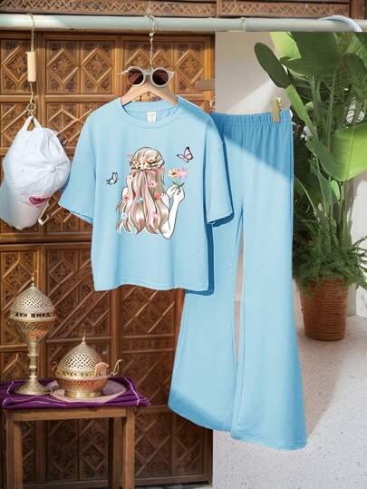 SHEIN Leap Crew Conjunto de 2 piezas de manga larga estilo casual y minimalista para niñas preadolescentes - Azul - Añade 1