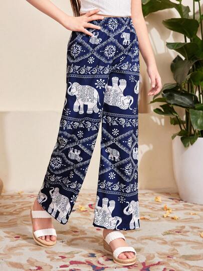SHEIN Pantalones anchos de cintura alta con estampado de elefante para niñas preadolescentes - Azul - Añade 1