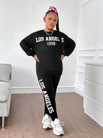 SHEIN Leap Crew Conjunto de 2 piezas de suéter de cuello redondo de punto y pantalones jogger casuales para niñas preadolescentes de talla grande - Negro - Añade 5