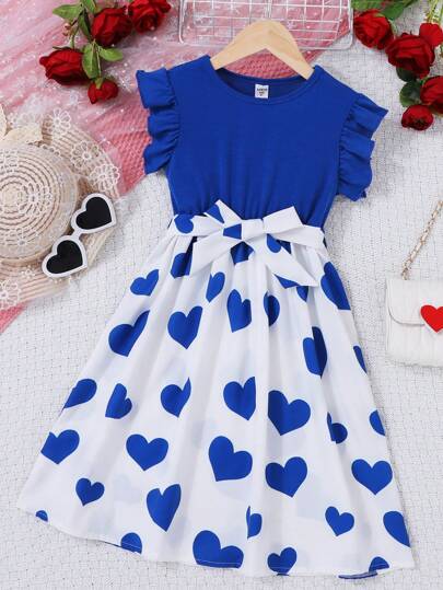 Vestido Con Estampado De Corazones Y Mangas Con Volantes Para Chicas - Azul - Añade 1