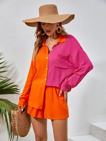 SHEIN Unity Ropa Dos piezas para Mujer Bolsillo Botón delantero Color combinado Casual - Multicolor - Añade 5